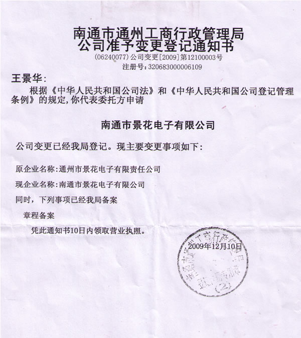由于行政區劃調整,原南通市下轄的通州市已經更改為南通市通州區,我公司的名稱和地址已相應變更。